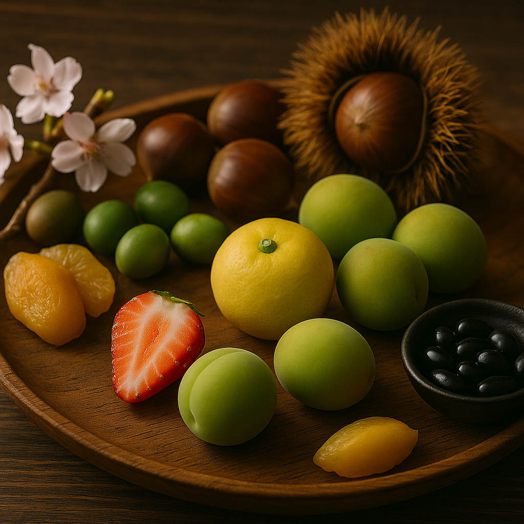 四季の恵みは、見た目の美しさだけでなく、香りや食感までもが主役です。 春は桜や苺、夏は柚子や青梅、秋は栗や芋、冬は柚子や黒豆など、 素材の持ち味をそのまま活かすことを大切にしています。